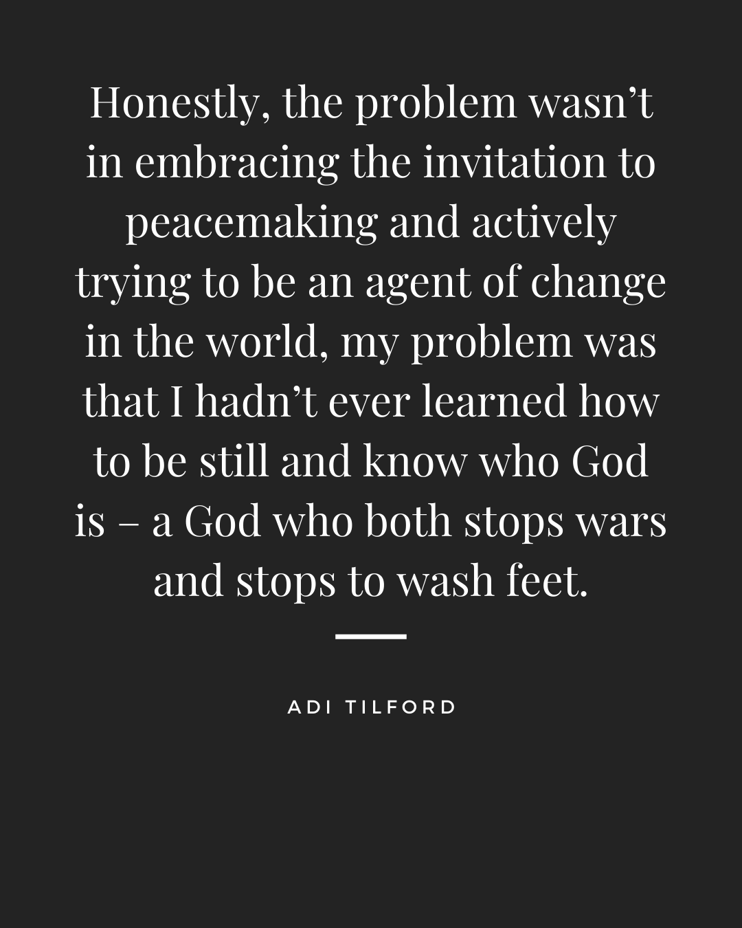 Honestly, the problem wasn’t in embracing the invitation to peacemaking and actively trying to be an agent of change in the world, my problem was that I hadn’t ever learned how to be still and know who God is – a God who both stops wars and stops to wash feet.